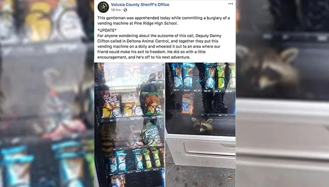 The Volusia County Sheriff’s department were in for a surprise when they arrived at Pine Ridge High School in Florida. A candy caper was afoot as a raccoon had climbed into a vending machine. He just wanted a snack and his pockets were empty. Don’t worry about the raccoon: the vending machine was brought outside and the furry bandit got away!