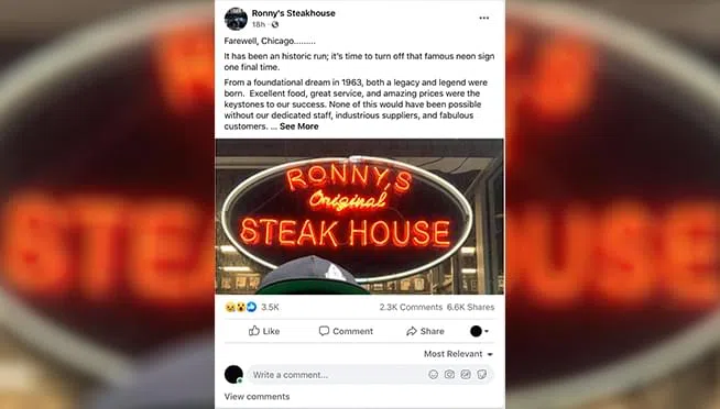 Ronny’s Steakhouse in The Loop says “Farewell to Chicago” – Closes after over 55 years of business | 94.7 WLS | WLS-FM
