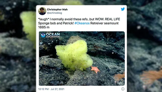 Marine biologist Christopher Mah tweeted out this image of a yellow sponge and pink starfish, calling them, “Real life Sponge bob and Patrick!”