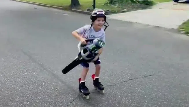 Watch this kid TAKE OFF on rolled blades with a LEAF BLOWER