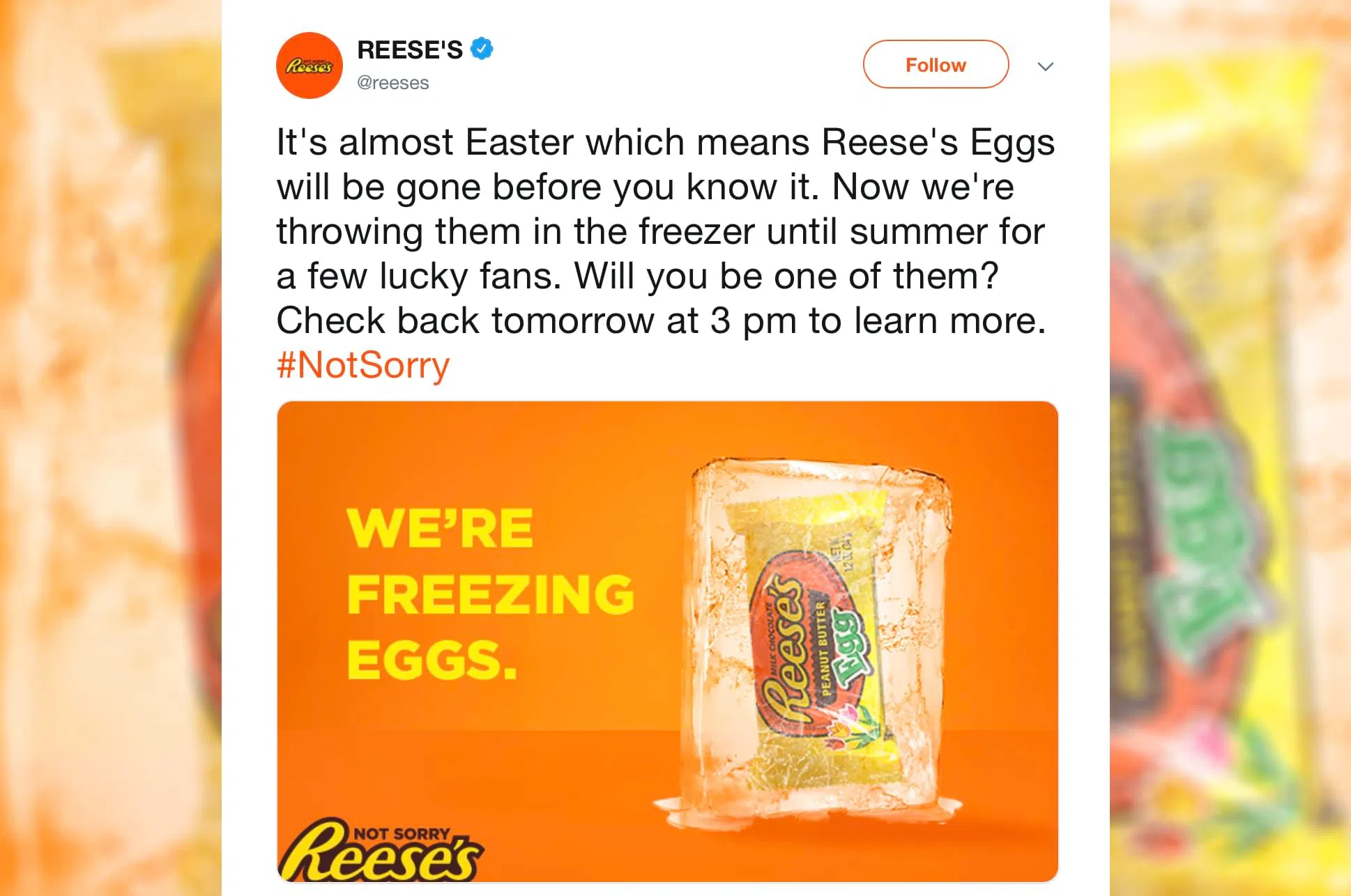 https://twitter.com/reeses/status/1117775110432329729 Reese’s is freezing some of their delicious chocolate peanut butter eggs and will be giving them away in a contest tomorrow (April 16th). Th...