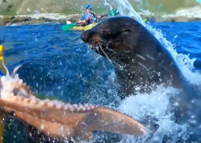 A seal slapping a kayaker with an octupus is the video that will make your day
